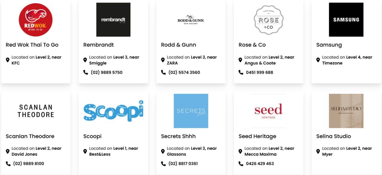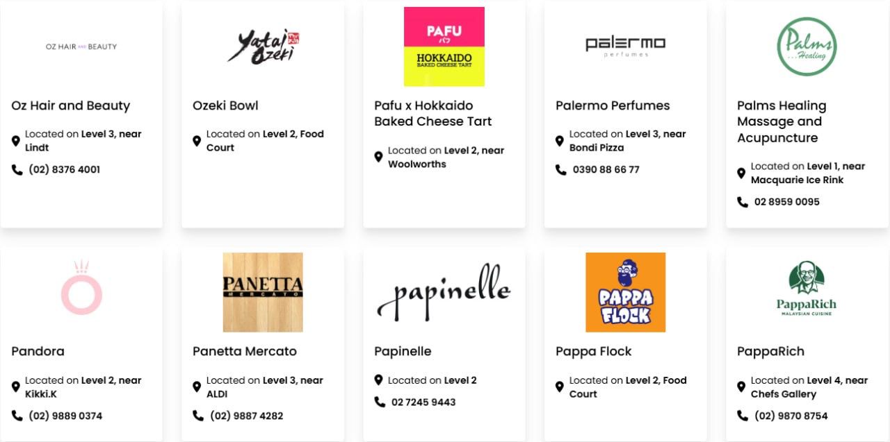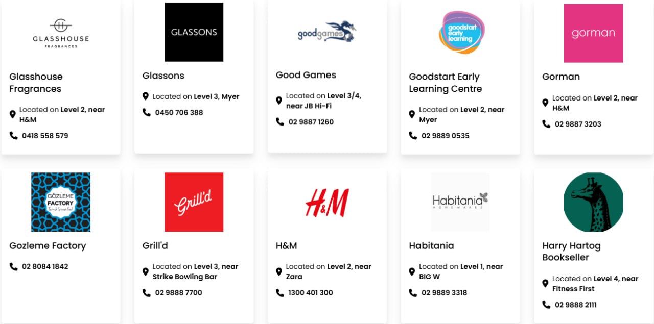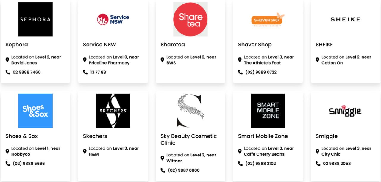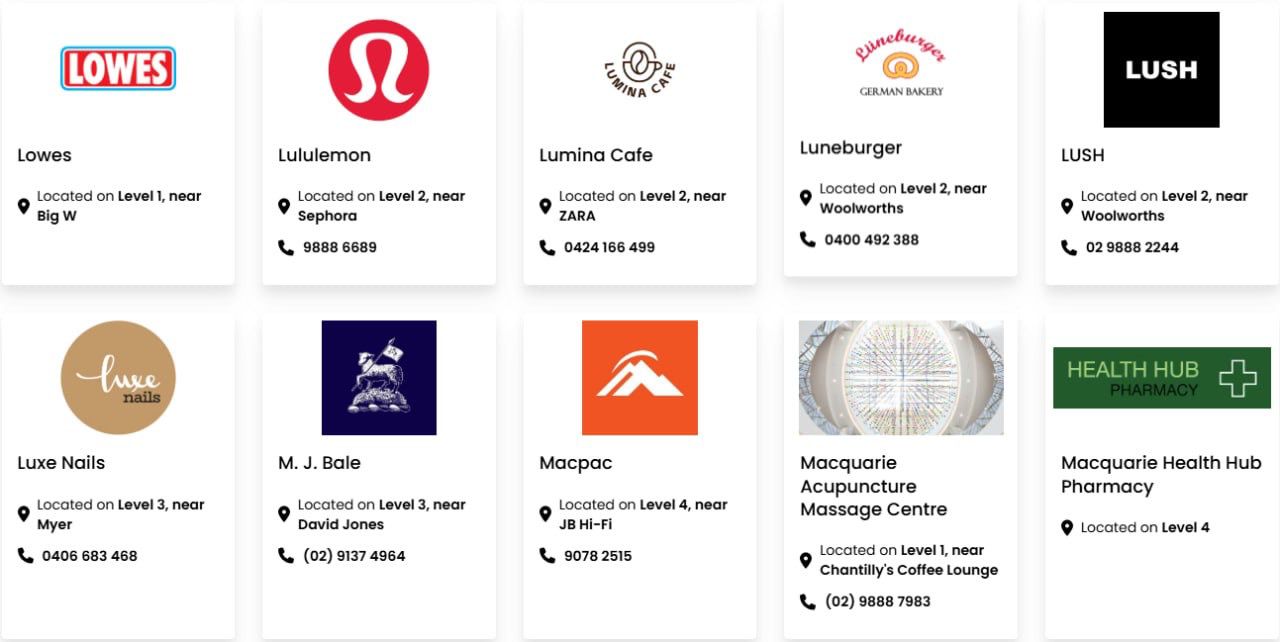 Macquarie Centre has 134,900m² of floor space. The major retailers include David Jones, Myer, Big W, Kmart, Aldi, Coles, Woolworths, Cotton On, H&M, Uniqlo, Zara, JB Hi-Fi, Rebel, Fitness First, Timezone, Strike Bowling Bar, Macquarie Ice Rink and Event Cinemas.